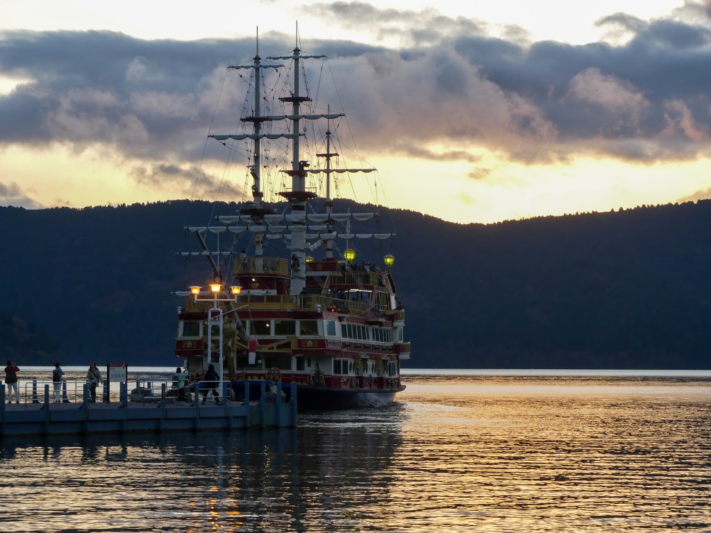 We boarded the pirate ship cruise, which adds a touch of fun to the experience. As the boat glided across the lake, we passed the iconic Hakone Shrine Torii Gate, which seems to float on the water. This red gate has become a beloved photo spot for visitors. After the cruise, we headed to Lake Side Inn MiraHakone, a cozy inn right on the lake’s edge.
